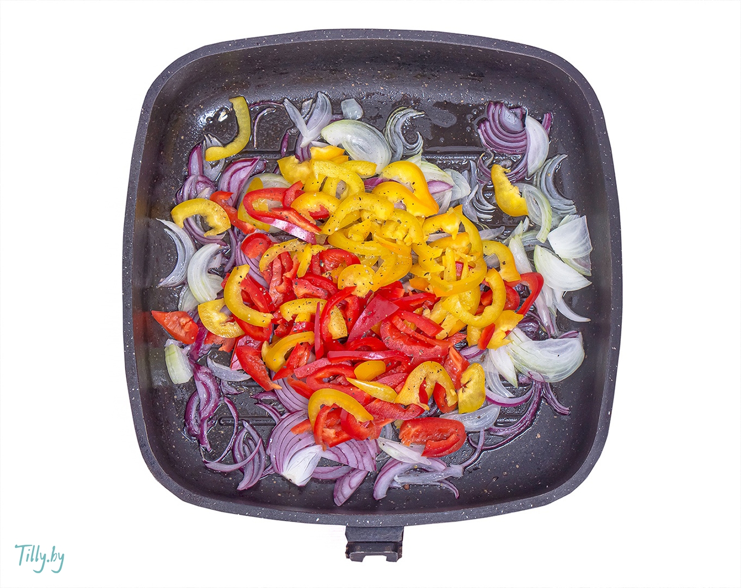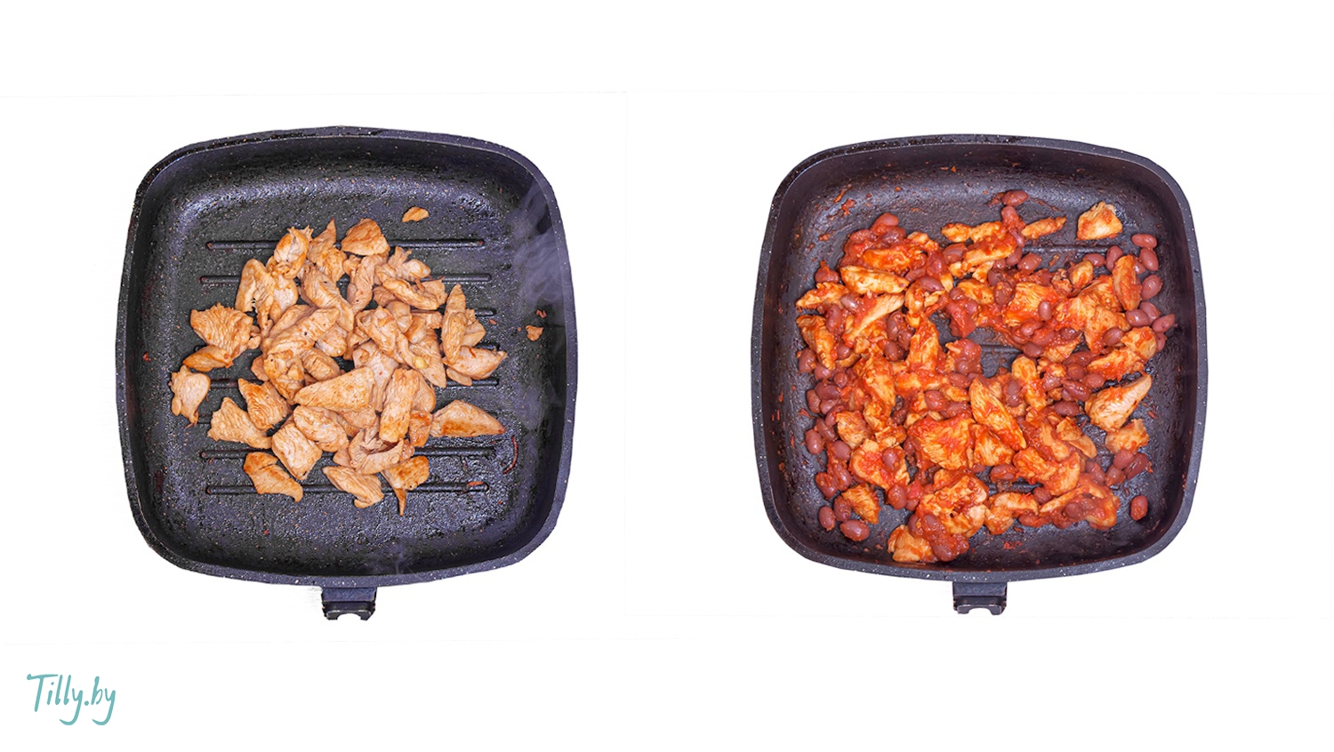 - Когда мясо приготовится, добавьте в сковороду перчик чили и отварную фасоль. Сдобрите солью и пряностями.