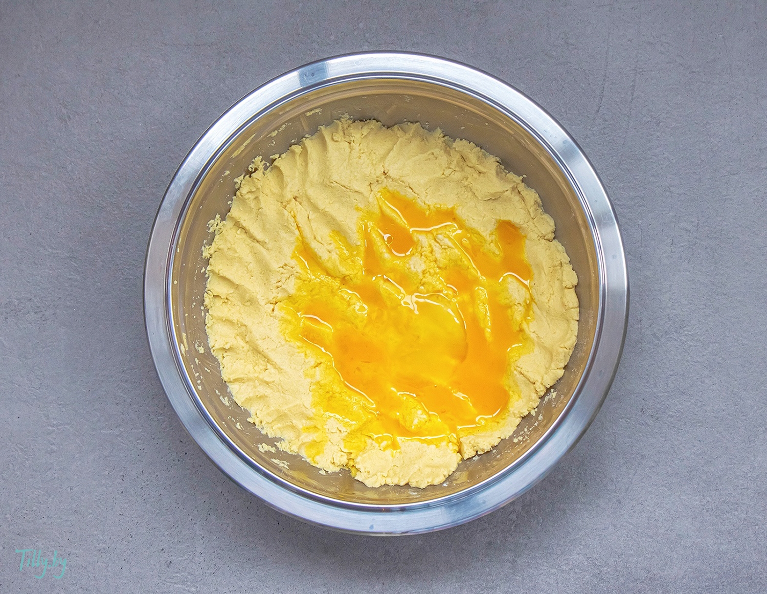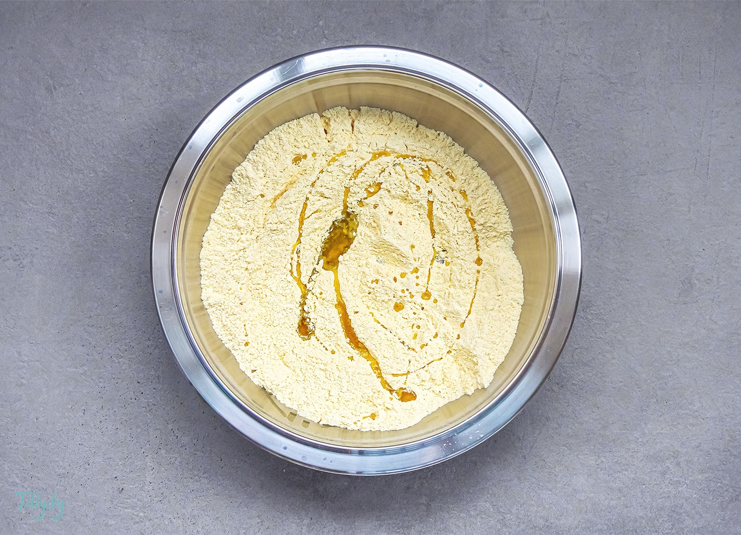 - Влить масло и снова перемешать тесто, пока оно не станет однородным. Оно должно получиться достаточно мягким, но не жидким.