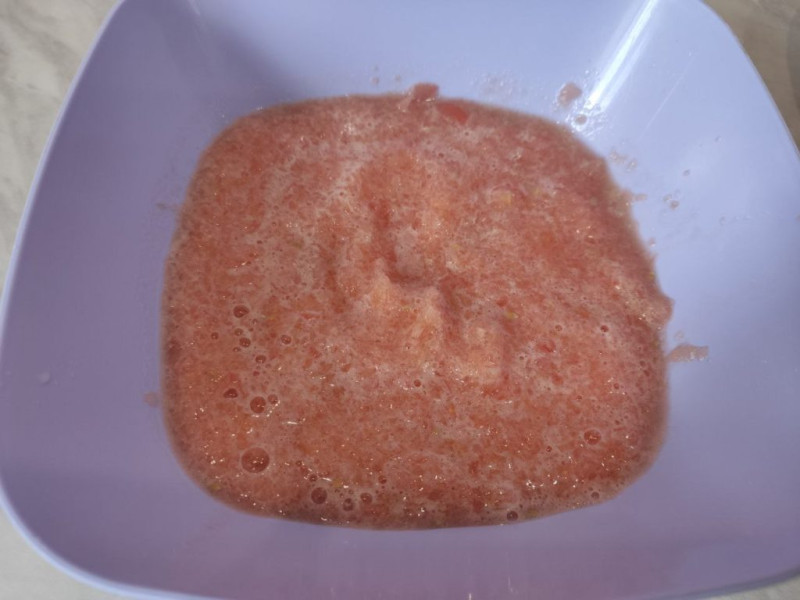 - Томаты обдать кипятком и снять кожицу. Измельчить в чаше блендера. Перелить к фаршу. Посыпать солью. Готовить полчаса под закрытой крышкой на минимальном режиме конфорки.