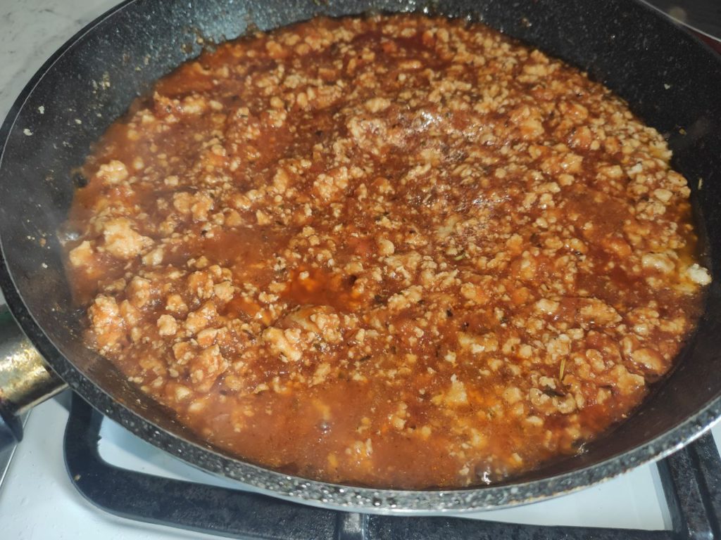 - Насыпать лук и готовить до румяного оттенка. Добавить фарш. Готовить постоянно перемешивая силиконовой лопаткой. Комочки не должны склеиваться. Когда мясо посветлеет, залить вином. Дождаться полного выпаривания.