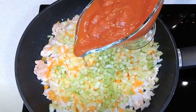 - Влить томатный соус и готовить 3 минуты.