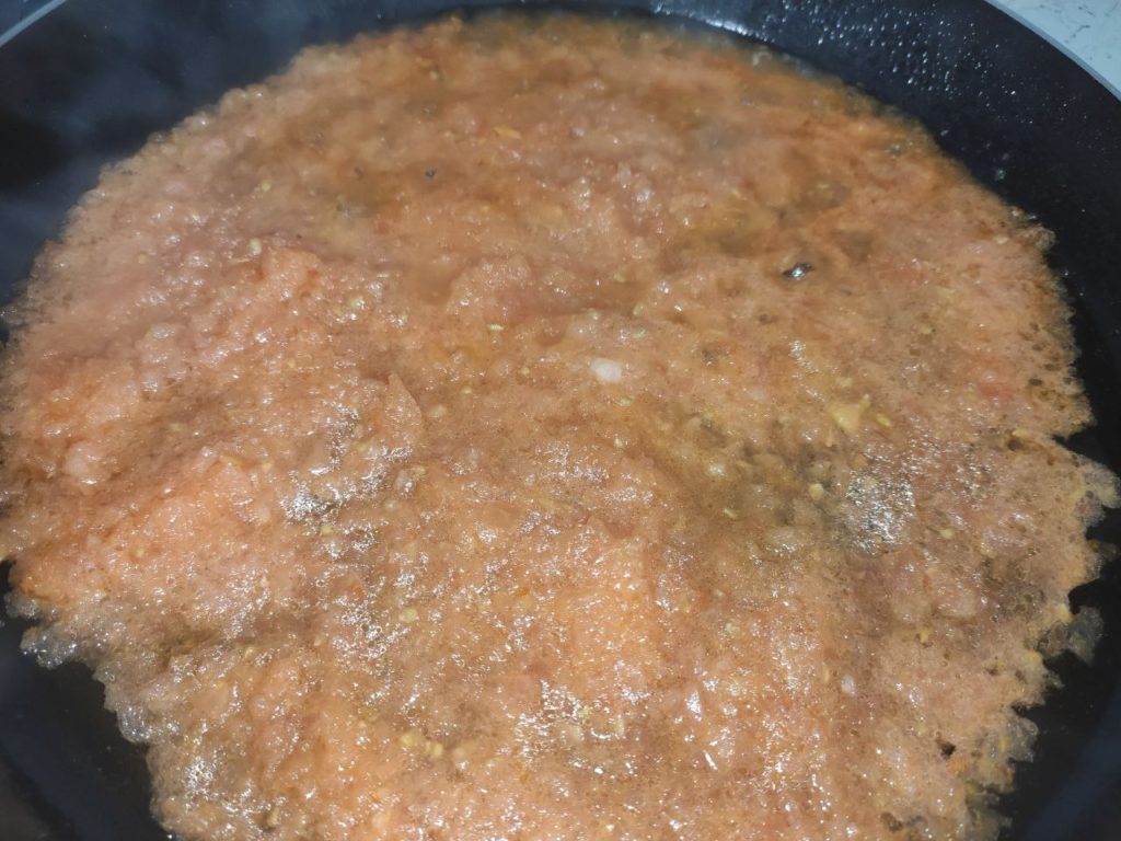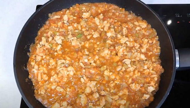 - В сковородку перемещается паста из томатов и консервированные помидоры. Масса тушится на среднем огне еще 7—8 минут, пока соус не загустеет.