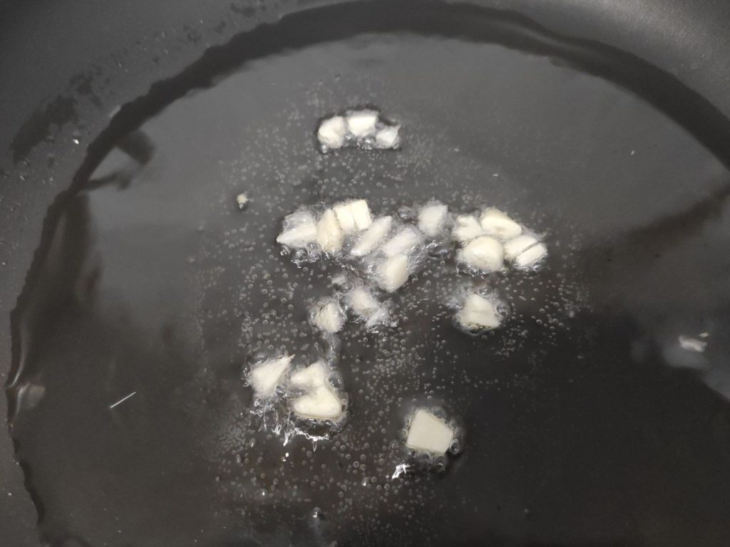 - Нарезать мелкими кубиками луковицу. Разрезать на части чесночные зубчики и отправить в горячее масло. Прожарить и выбросить чеснок.