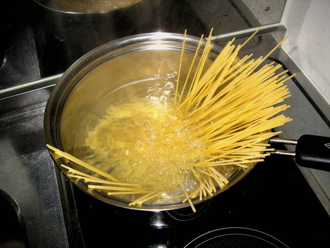 - Пока соус готовится, необходимо отварить макаронные изделия. Вскипятить воду, посолить и опустить в нее спагетти. По мере размягчения, они полностью погрузятся в воду. Варить их нужно 10 минут на тихом огне, не накрывая крышкой. Готовые изделия откинуть на дуршлаг, а после того как стечет вода, пересыпать обратно в кастрюлю. Влить 1 ст. ложку оливкового масла и перемешать.