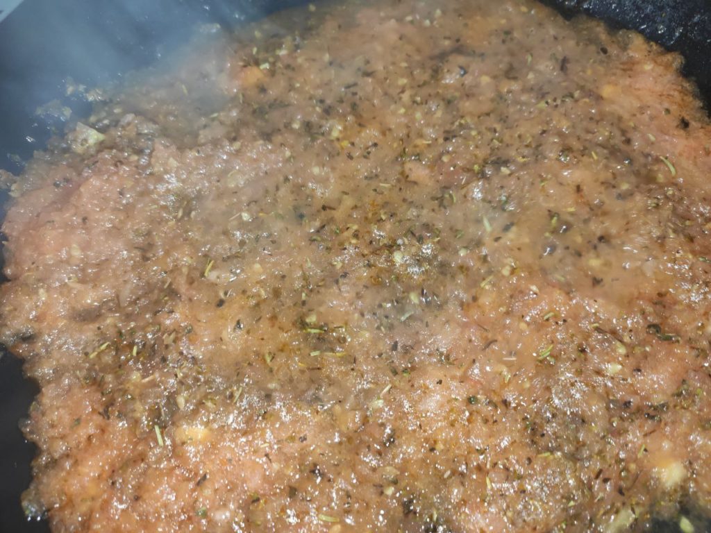 - Потомить смесь 3 минуты и влить томатную пасту. Когда масса закипит, посолить и насыпать итальянские травы.