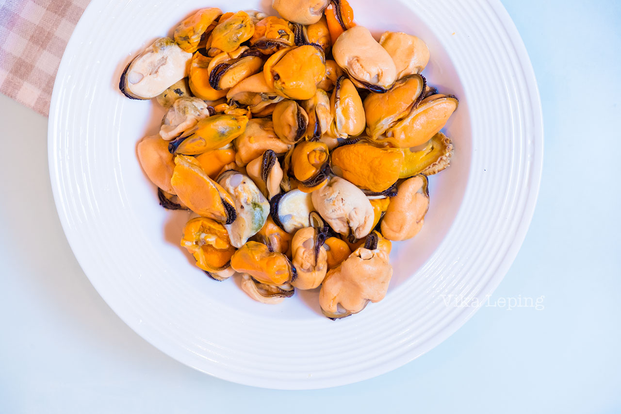 - Мидии отбросить в дуршлаг, дать воде полностью стечь. Лимон выкинуть.