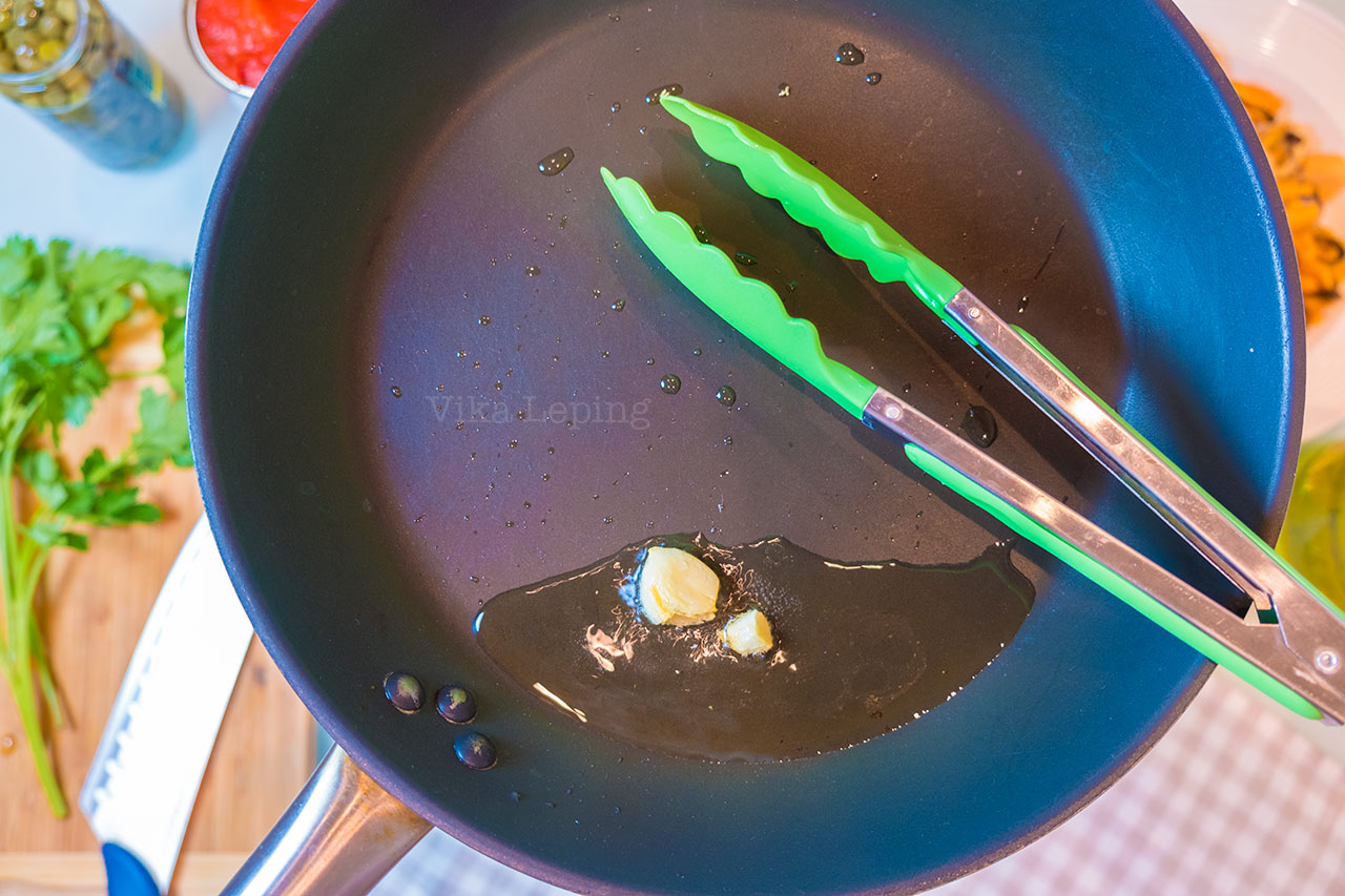 - Греем сковороду на среднем огне, наливаем оливковое масло, кладем очищенный, придавленный зубчик чеснока, обжариваем 25 секунд и выбрасываем.
