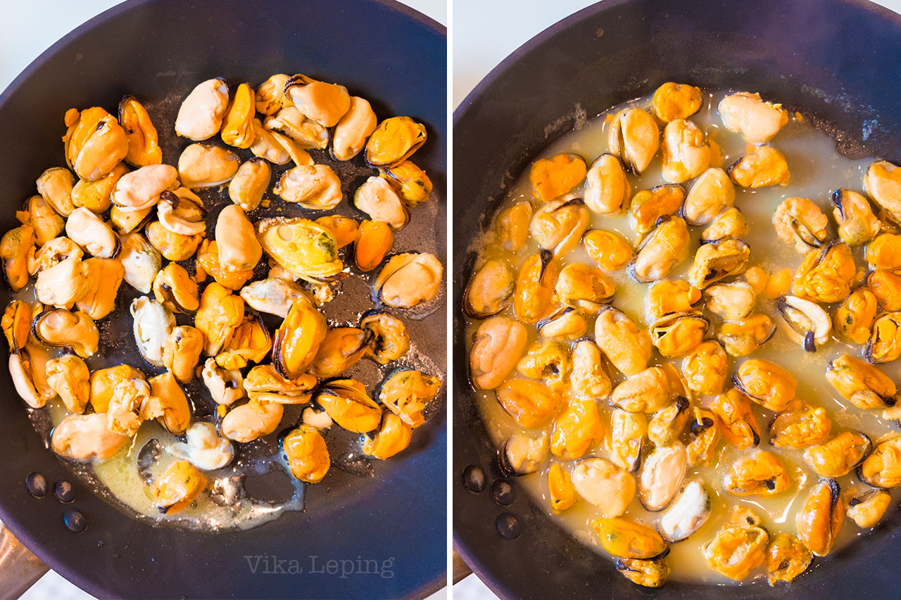 - В сковородку всыпать мидии, хорошенько перемешать содержимое.