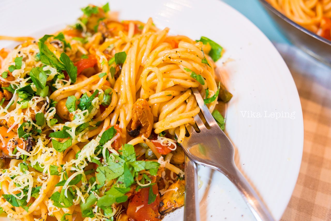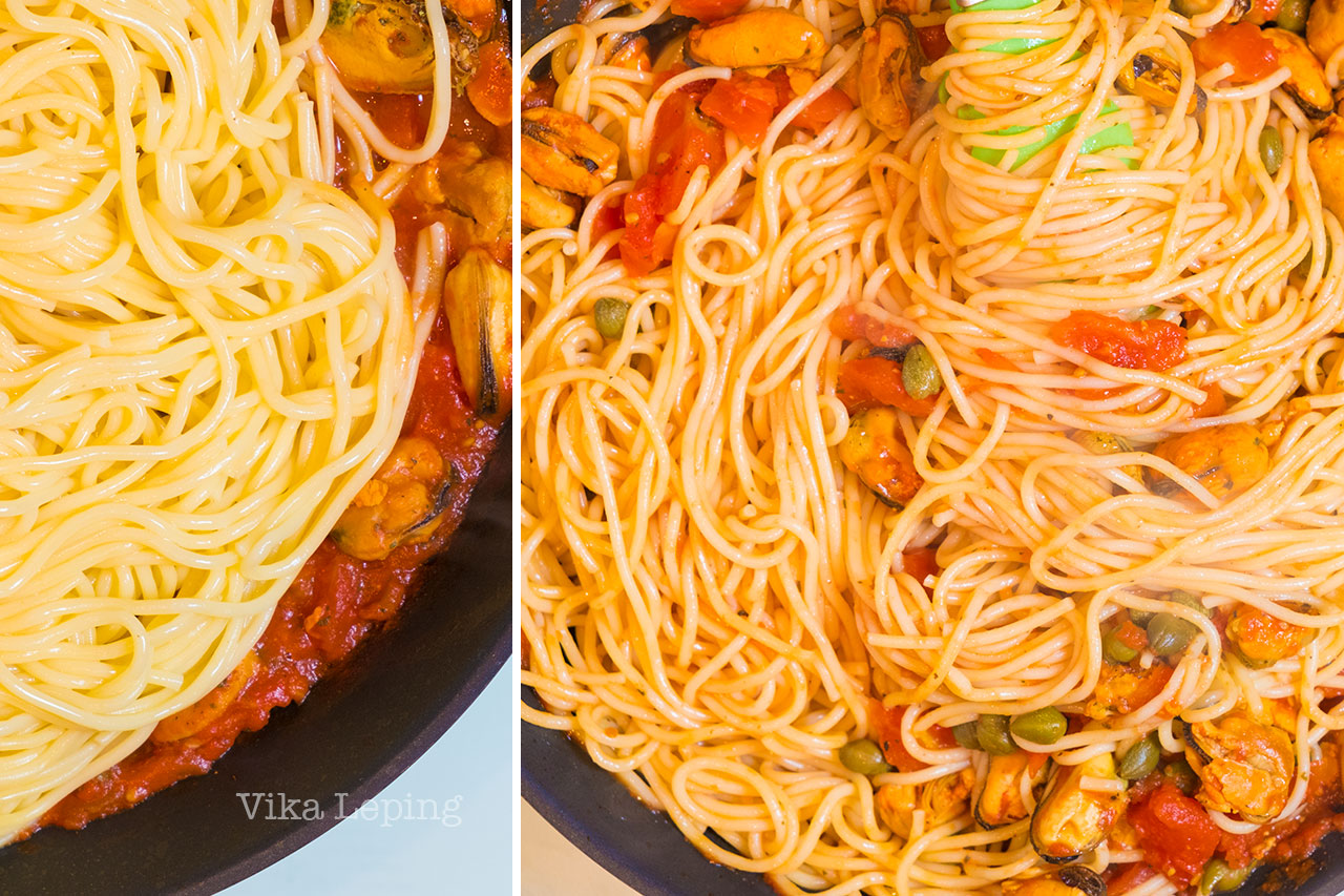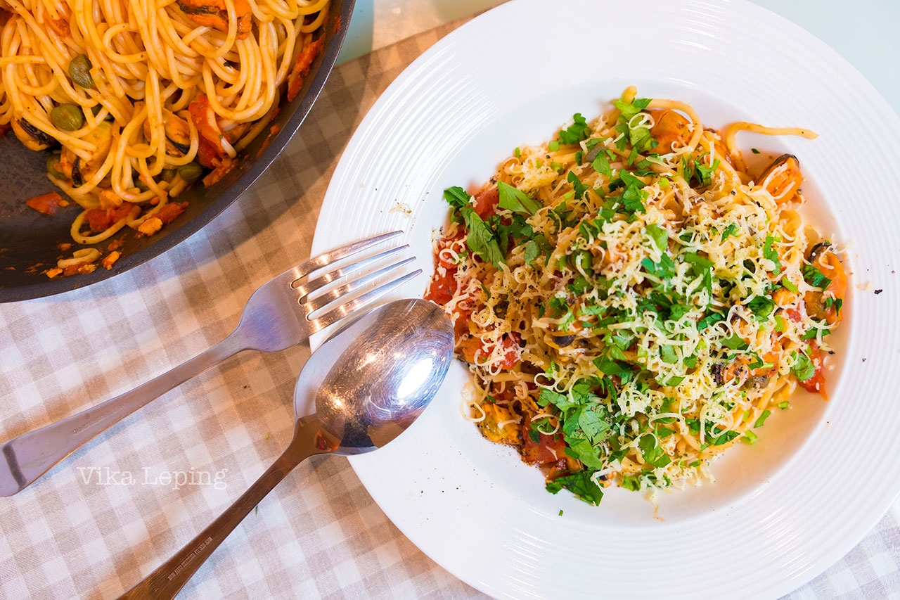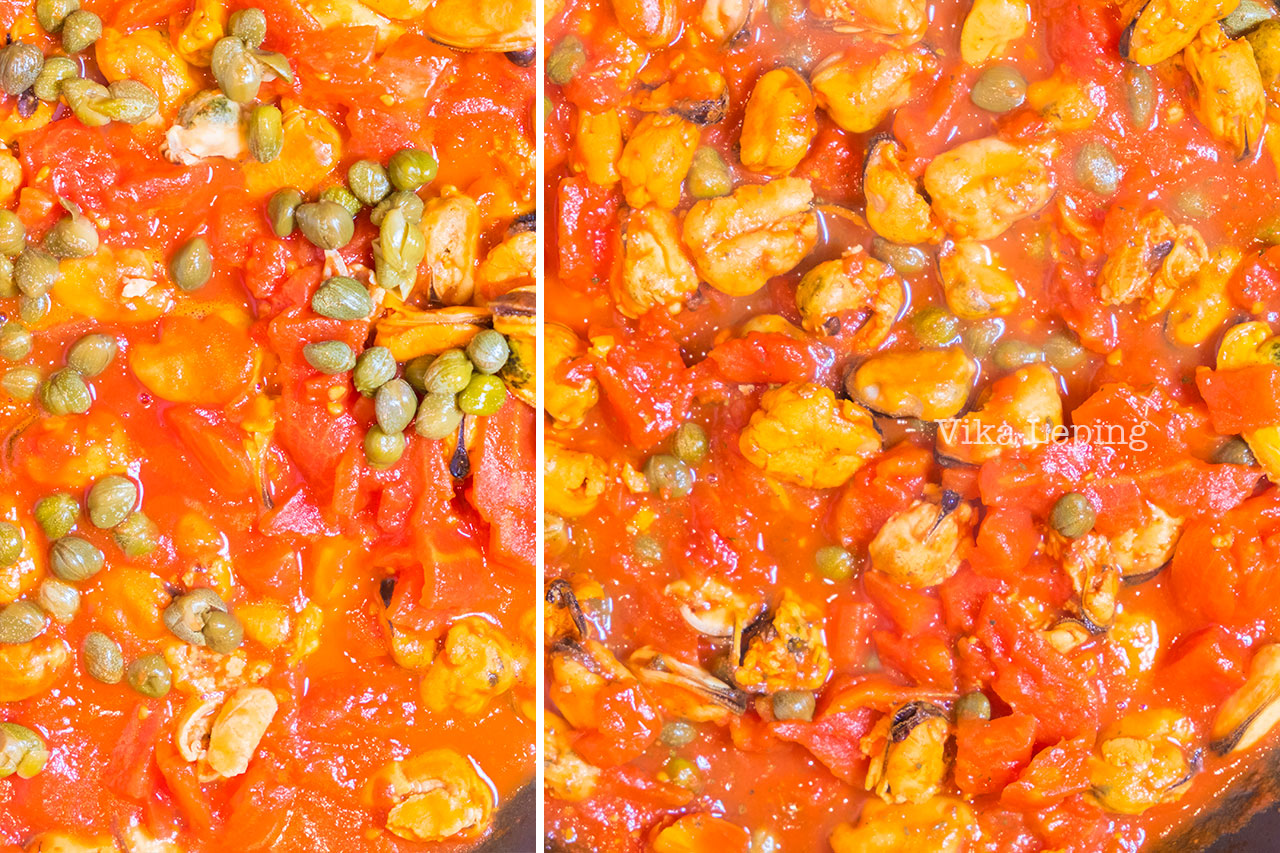 Последним штрихов добавляем каперсы. Они придадут нотку пикантности и такой себе «средиземности». Не переборщите, иначе каперсы затмят другие вкусы! Тушим еще минуту. Забыла сказать, что если заменить томаты на нежирные сливки, то получится паста с мидиями в сливочном соусе. Так тоже неплохо. А можно и в помидоры добавить сливки, тогда будет еще интереснее!