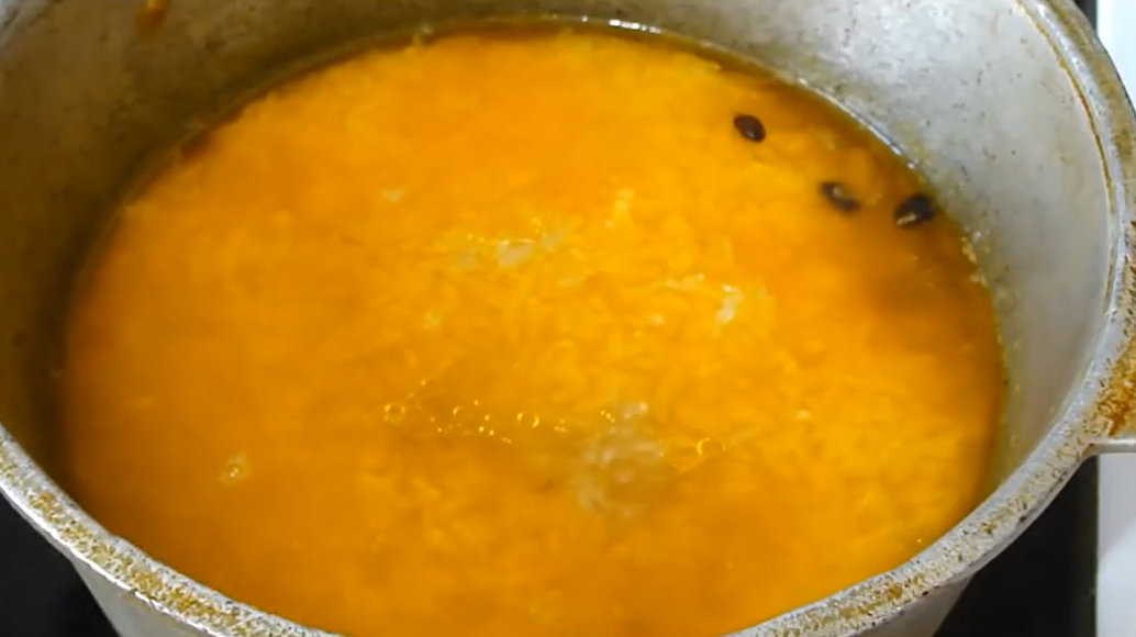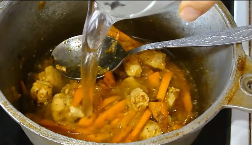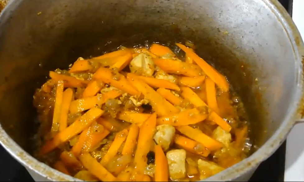 3. Затем положите морковь, нашинкованную крупной соломкой. Налейте сразу же холодную воду до уровня содержимого казана. Тушите на медленном огне до полного размягчения моркови. Затем положите специи.