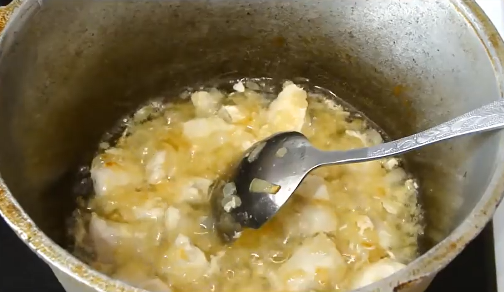 2. В казан наливаем растительное масло, разогреваем и кидаем туда лук. Обжариваем до золотистого цвета.