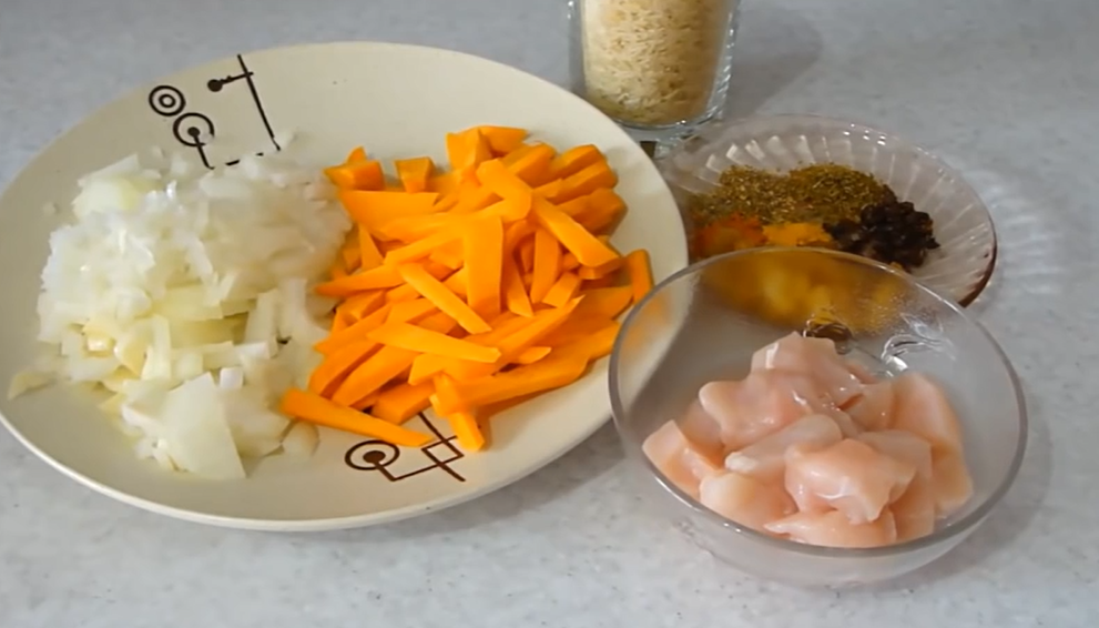 Продукты: по 300 г филе курицы и риса, масло раст. 90 г, небольшая луковица, приправа для плова, соль, зира, пара больших луковиц, три морковки, чеснок – 3 зубчика.