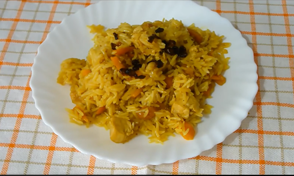 Ингредиенты:(6 порций) — 1 курица — 1,5 стакана риса — 2 луковицы — 2 морковки — 1 головка чеснока — 10 шт. чернослива — 1 ч. л. зиры (кумина) — 0,5 ч. л. куркумы — 1 пучок петрушки — 1 пучок кинзы — 1 пучок укропа — 100 мл растительного масла — соль, перец