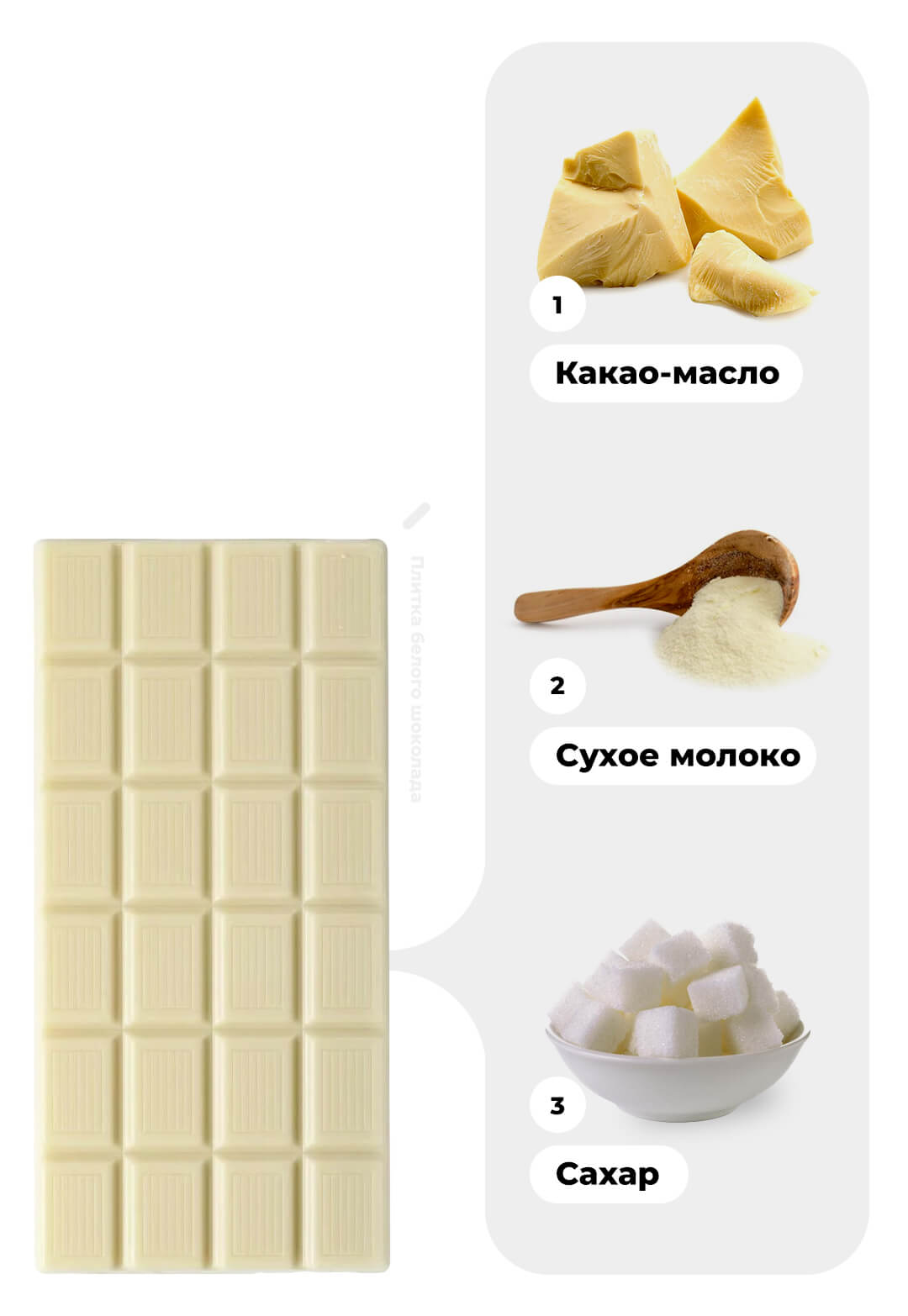 Обычный белый шоколад готовится из следующих ингредиентов: