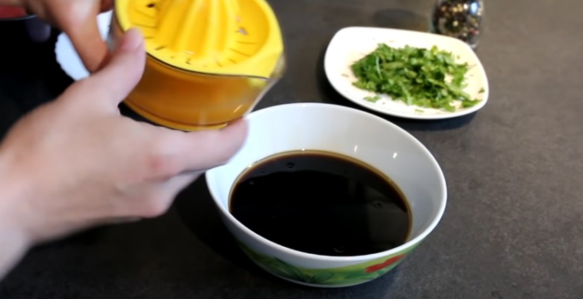 Обратите внимание, что лимонного сока необходимо совсем немного, иначе мясо побелеет. Солить не нужно, так как в рецепте используется соевый соус