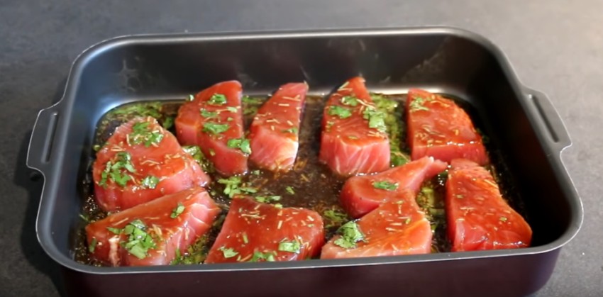 Поскольку мясо тунца нежирное, а мышечные волокна плотные, рекомендуется смягчить их маринадом. Кроме того, маринад помогает выразить различные вкусовые качества блюда из тунца.
