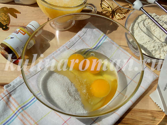 1. Яйца взбить с сахаром миксером до пышности