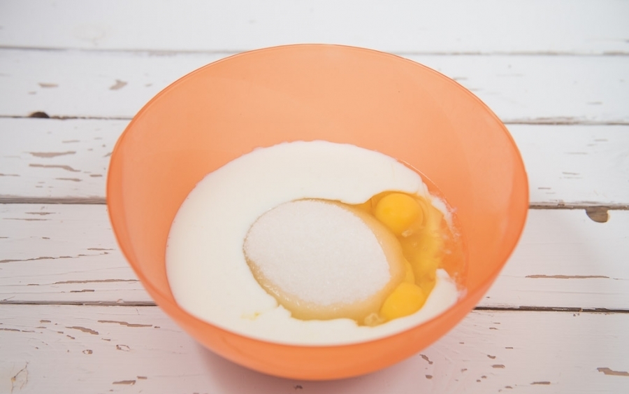 Яйца разотрите с сахаром, полученную массу переложите в молоко, добавьте соль. Все хорошо перемешайте.