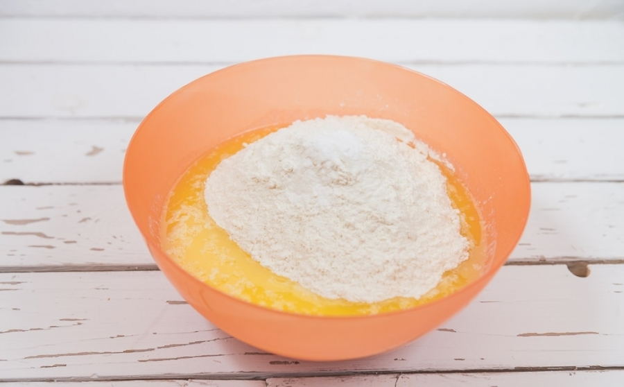 - В эту же емкость добавить муку и взбить продукты до получения однородной массы.