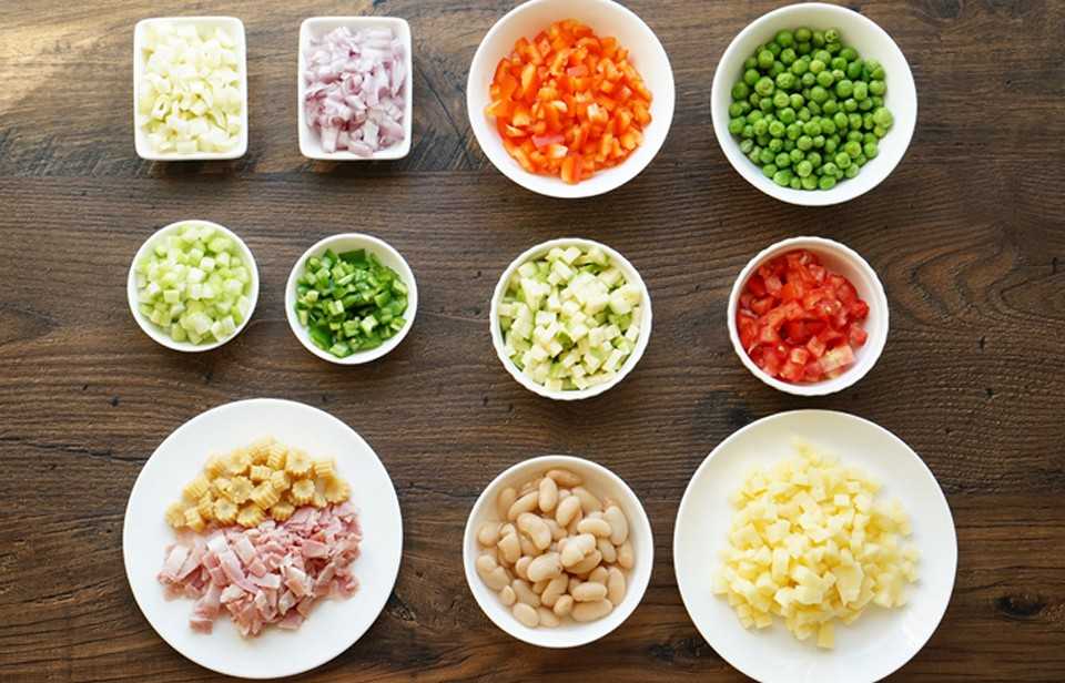 Все ингредиенты должны быть свежими – за исключением консервированного горошка и отваренной фасоли.