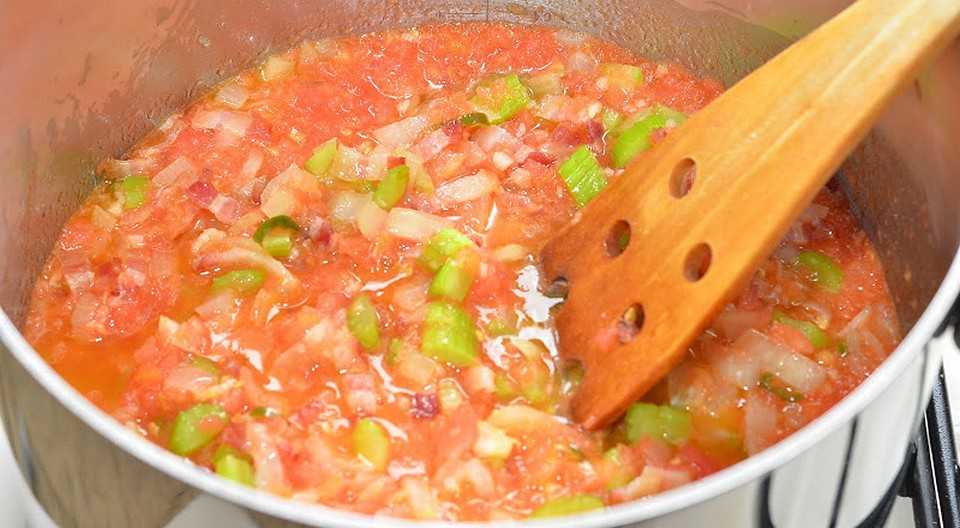 Добавить к бекону смесь из лука, сельдерея и перца и потушить около 15 минут;