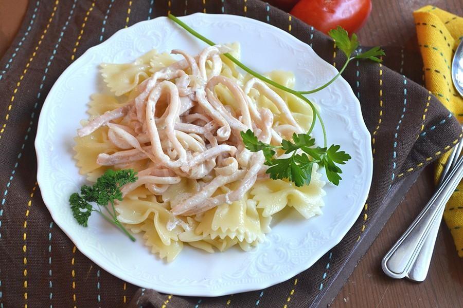 В классических рецептах кольца кальмара готовят в кляре, но такое блюдо калорийное и вредное. Мы предлагаем более оригинальный способ – в белом вине и сливках.