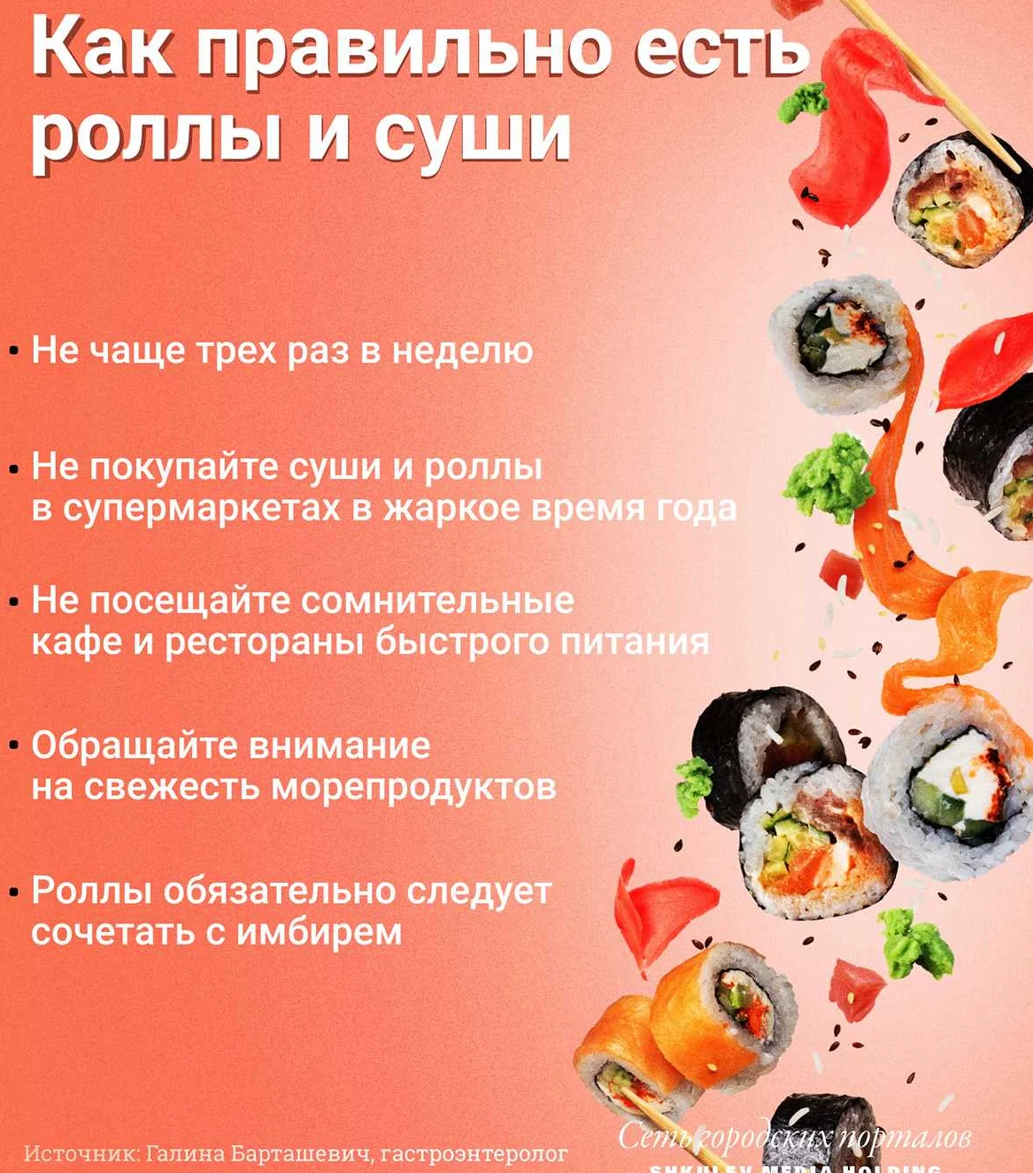 Для избегания проблем со здоровьем диетологи рекомендуют питаться суши не чаще двух-трех раз в неделю. Для блокировки роста вредных организмов есть лучше с добавлением васаби, который является антисептиком.