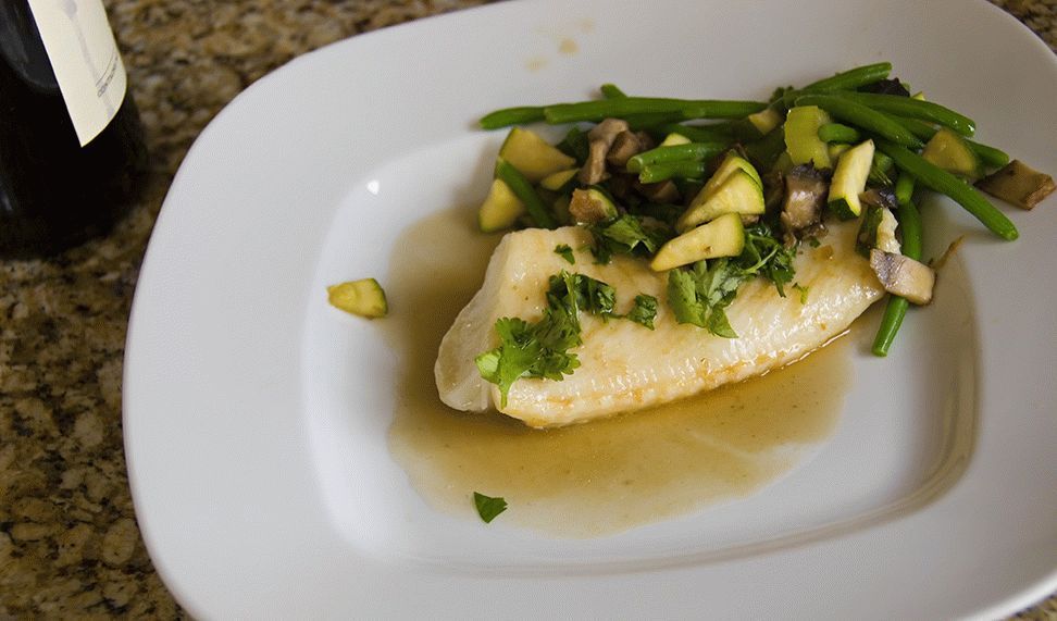 - Рыбу нарезать на порционные куски или стейки, обжарить в растительном масле, предварительно обваляв в смеси из муки, соли и черного перца. Сильно зажаривать рыбу не следует, она должна быть нежной.