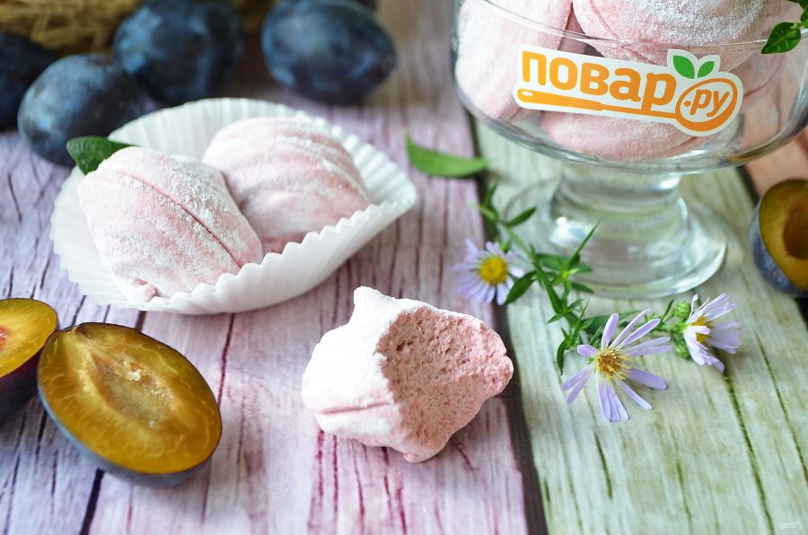 Перелейте сливовую заготовку в рослую чашу или чашу миксера, включите миксер на максимальные обороты и вводите охлажденный белок. Масса увеличится в 2-3 раза и сделается плотнее.