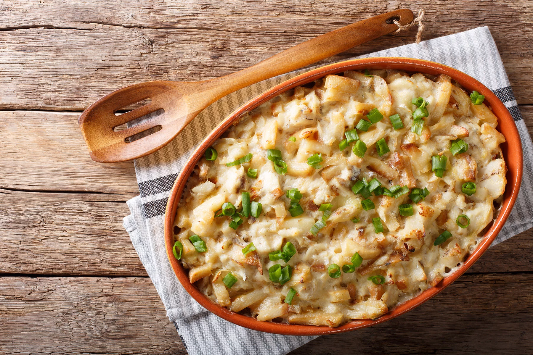 Знаете, когда я еще не понял весь вкус бакаляу, это блюдо у меня было самое любимое. У него только один недостаток — калорийность. Кусочки трески со сливками бешамель, картофелем, луком и посыпанное сыром, запекаются в духовке.