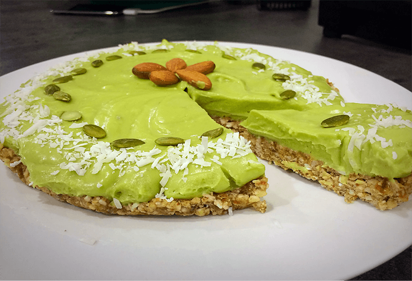 Подложку для пирога делаем из фиников, орехов и семечек. Крем из авокадо взбиваем в блендере, добавляем замороженный банан, все остальные ингредиенты и снова взбиваем до густоты. Пирог ставим в холодильник на 2 часа.