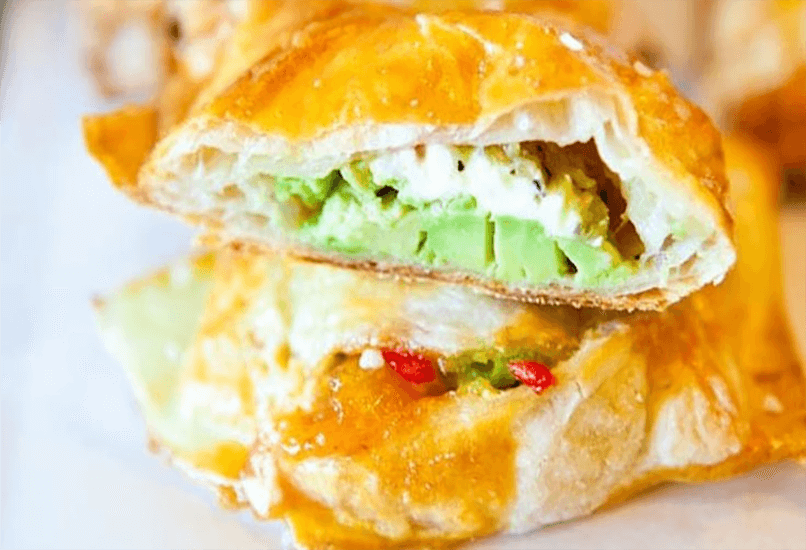 Готовятся пирожки очень быстро, потому что начинка не смешивается. На тесто выкладываем по чайной ложке соуса, тертого сыра и кусочки авокадо. Запечатываем пирожок – и готово!