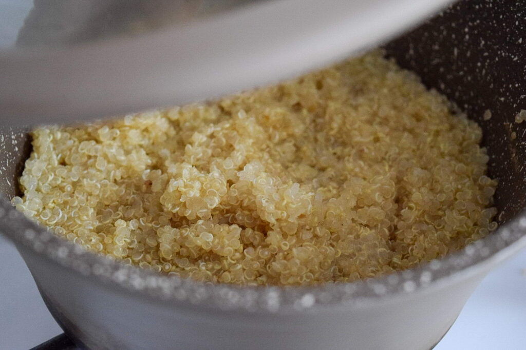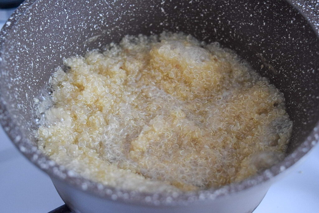 - В это время прополощите 2/3 стакана киноа в холодной воде, высыпьте ее в небольшую кастрюлю и залейте 2 стаканами холодной воды. Приправьте щепоткой соли и доведите до кипения. Уменьшите огонь и готовьте до мягкой консистенции. Процедите киноа и отставьте пока в сторону.