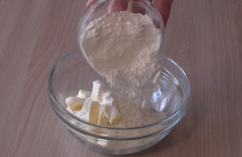 В миску насыпаем муку и натираем охлажденное сливочное масло.