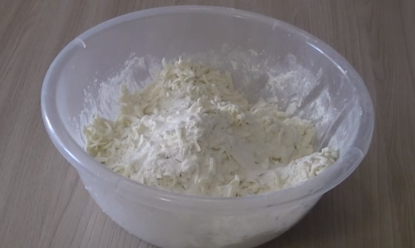 Смешиваем два вида натертого сыра и творог. Для рецепта лучше использовать сухой творог, так его будет легче размешивать с остальными ингредиентами. Можно немного присолить начинку по вкусу.