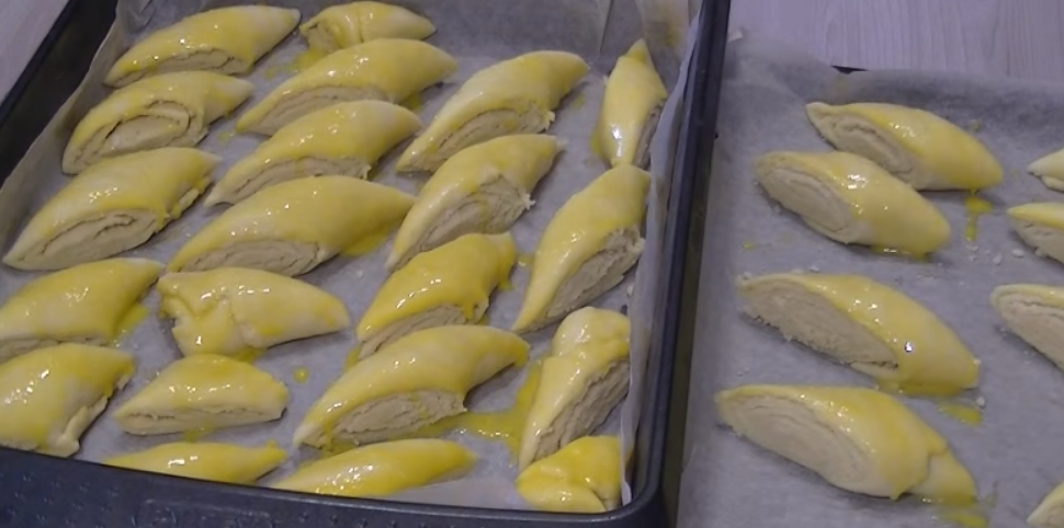Осталось выложить печенье на противень, застеленный пергаментом и сверху смазать яйцом. По желанию можно посыпать орехами или маком.