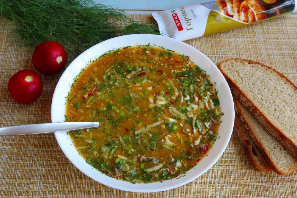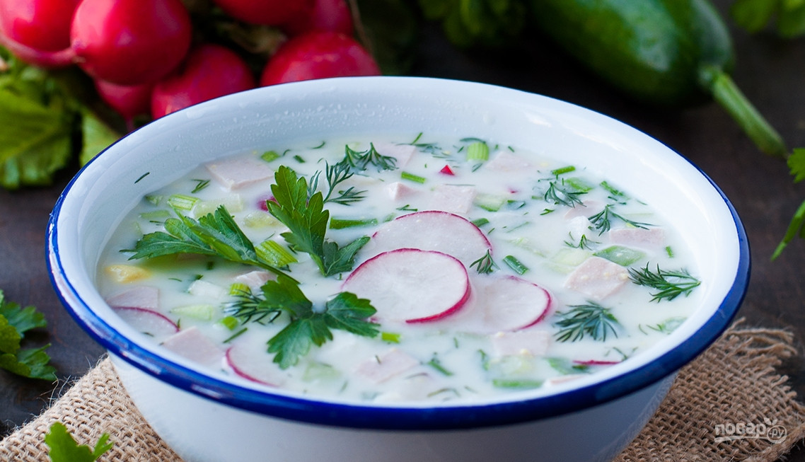 Редиска, варёная колбаса и много зелени – это главные компоненты русской традиционной окрошки. Содержащиеся в супе продукты очень важны и полезны для человеческого организма. Особенно огромную роль играет сам квас, поэтому лучше всего использовать домашнего приготовления. На природе в летнюю жару холодный супчик наполненный массой необходимых витаминов не только утолит жажду, но придаст сил на целый день. Поэтому берёмся за дело и приступаем к созданию самого простого и быстрого холодного первого блюда!