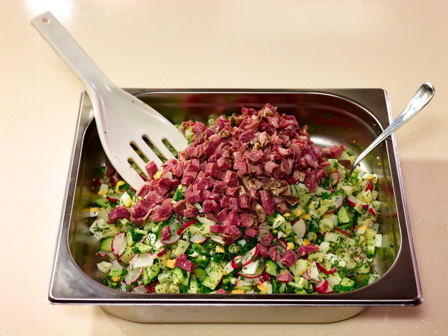 - Часть продуктов (говядину, картофель и яйца) придется приготовить заранее, поскольку в блюдо они кладутся в холодном виде.