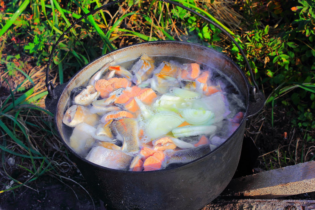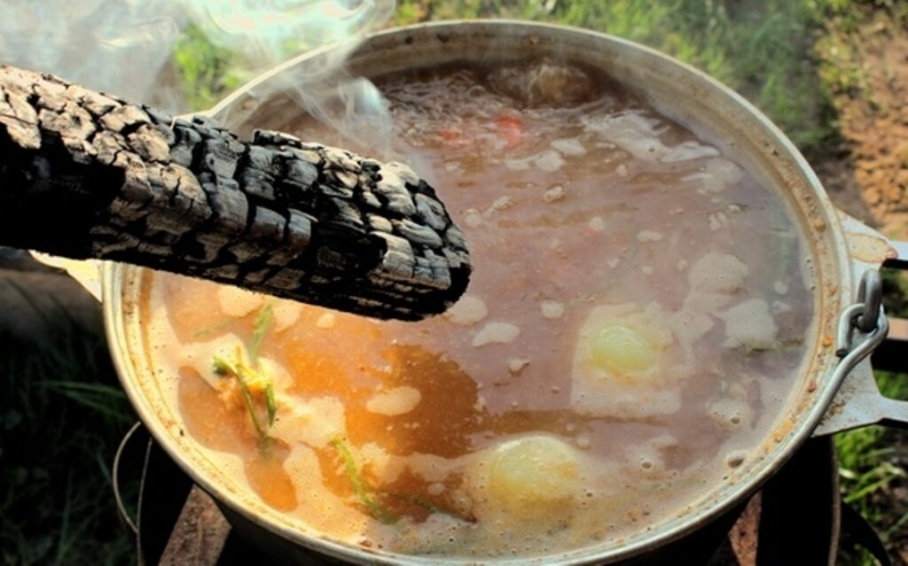 - И финальный штрих: взять из костра достаточно крупную головешку, очистить ее от лишнего пепла, чтобы он не попал в уху, и продержать ее несколько секунд в котле, чтобы она потухла. Приятного аппетита!