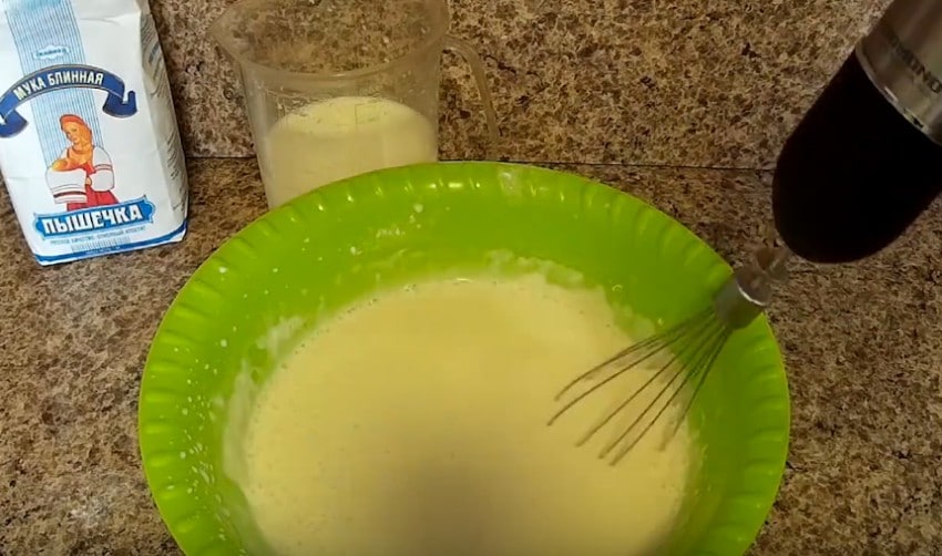 - Жидкость и блинную смесь перемешивают при помощи венчика или миксера до образования однородной массы.