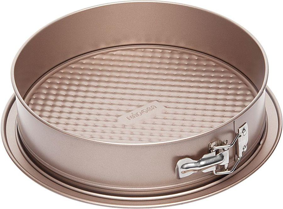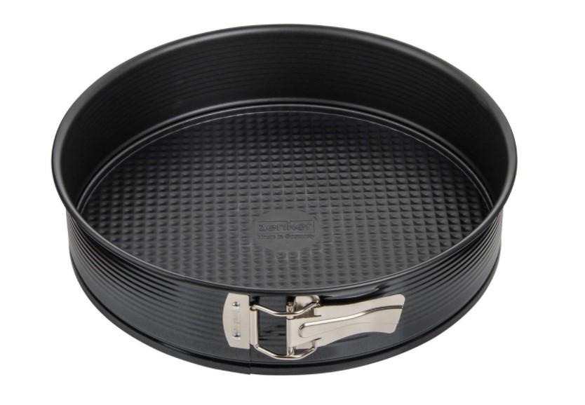 Открывает рейтинг круглая разъемная форма для выпечки от известной качеством своих работ чешской компании. Диаметр – 25 см. Для производства используется высококачественная углеродистая сталь с нержавеющим покрытием Quantum. Рифленое дно не позволяет тесту пригорать и прилипать, а также помогает легко вынуть готовый бисквит. Его можно использовать в качестве отдельного блюда.