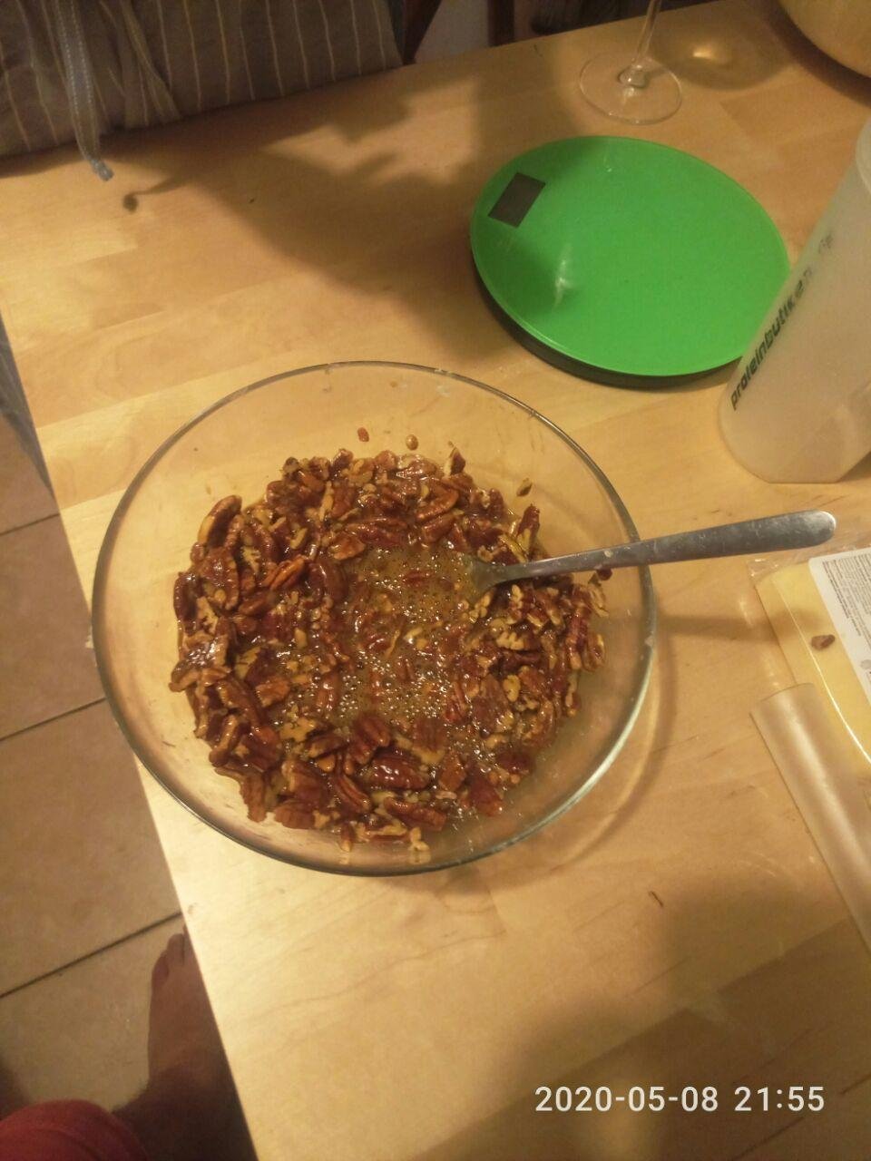 Вообще это то самое место где как раз варьируется толщина финального пирога в зависимости от того, сколько взяли орехов. Если хочется прям обалденный слой орехов, то можно взять хоть 400 грамм, главное чтобы ореховый слой начинки не вылезал за края пирога. Но можно взять и 200 грамм и тогда просто у получившегося продукта будут высокие бортики. На вкус это практически не повлияет.