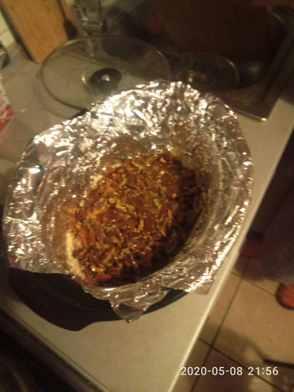 8. Полстакана пеканов отложите для украшения, а оставшиеся орехи крупно порубите ножом. Выложите в форму с тестом. Залейте карамельной смесью, а сверху красиво разложите целые орехи.