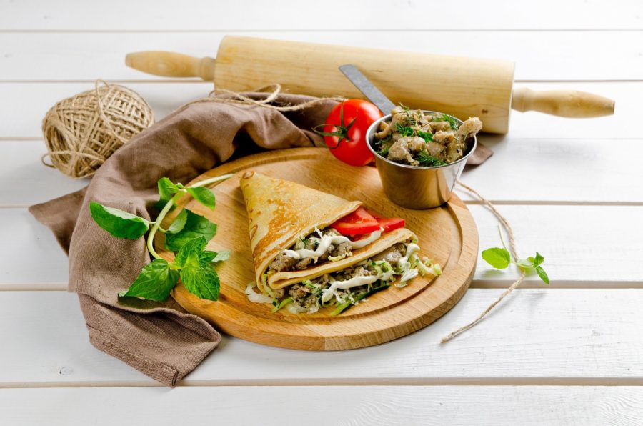 - Затем на блин по очереди выкладываются другие компоненты – мясо, капуста + морковь, редис + салат. Останется только сложить его пополам и разогреть на сковороде, в духовке или микроволновой печи.