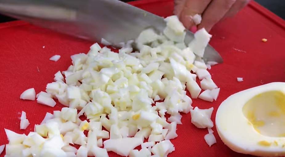 - Куриные яйца варю вкрутую (7 -10 минут после закипания воды). Остужаю и крошу помельче. Добавляю в салат яйца и тёртый сыр. Солю, перчу и перемешиваю, добавив майонеза. Рецепт домашнего майонеза здесь.