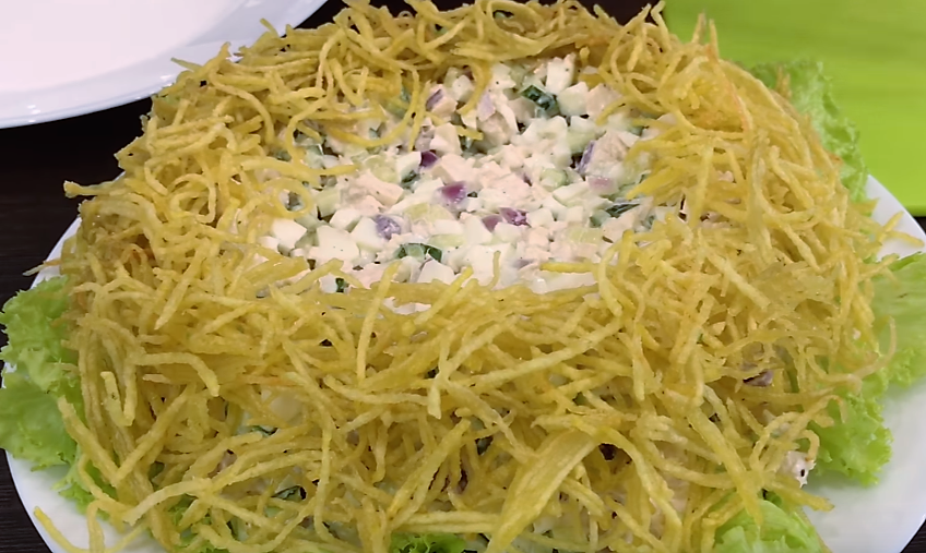 Классический рецепт салата «Гнездо глухаря» с курицей