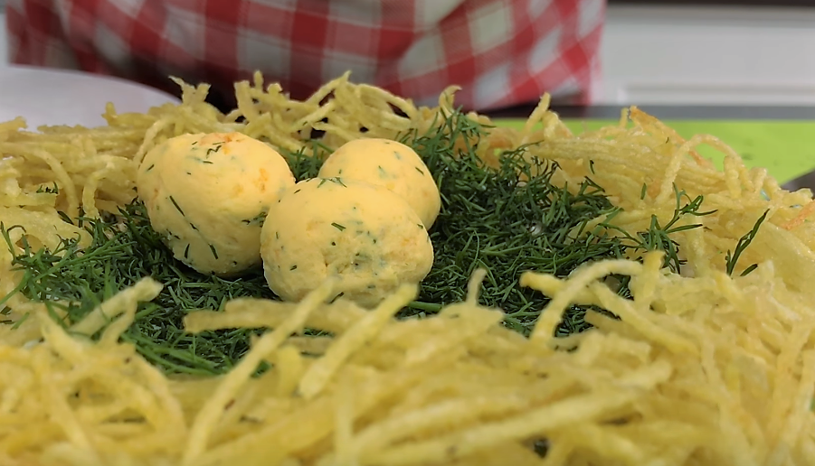 6. Укроп, 1 веточку мелко искрошить и добавить к яичной массе. Скатать из получившейся смеси “яйца глухаря”, предварительно разделите желточную массу на 10-12 равных частей. Мы делали 10 яиц, они получились крупными для такого гнезда, поэтому лучше сделайте 12 штук меньшего размера.