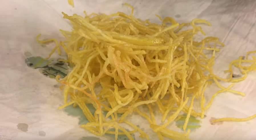 8. Разложить картофельную соломку на хлопчатобумажном полотенце и просушить. Это нужно сделать обязательно прежде, чем опускать картошку в кипящий фритюр.