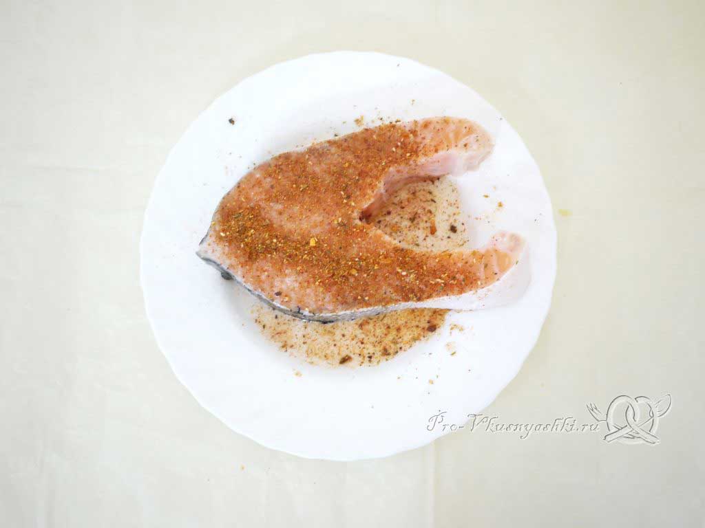 Затем посыпаем рыбу специями и солью (по 1 ч.л). Много пряностей использовать не нужно, так как они могут перебить вкус семги.