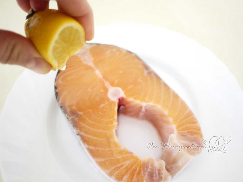 Стейк из семги моем, выкладываем на тарелку с углублением и поливаем (сбрызгиваем) лимонным соком (1 ст.л).